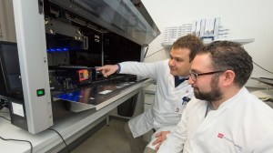 Univ. Prof. Dr. Philipp Wild, Leiter der Biobank für Bioliquide und Dr. Antonio Pinto, Biobankmanager, vor der neuen Robotikplattform. Foto: Peter Pulkowski (Universitätsmedizin Mainz)