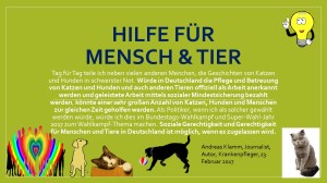 Ludwigshafen am Rhein. 23. Februar 2017. Hilfe für Menschen & Tiere ist in Deutschland möglich. Tag für Tag teile ich neben vielen anderen Menchen, die Geschichten von Katzen und Hunden in schwerster Not. Würde in Deutschland die Pflege und Betreuung von Katzen und Hunden und auch anderen Tieren offiziell als Arbeit anerkannt werden und geleistete Arbeit mittels sozialer Mindestsicherung bezahlt werden, könnte einer sehr großen Anzahl von Katzen, Hunden und Menschen zur gleichen Zeit geholfen werden.